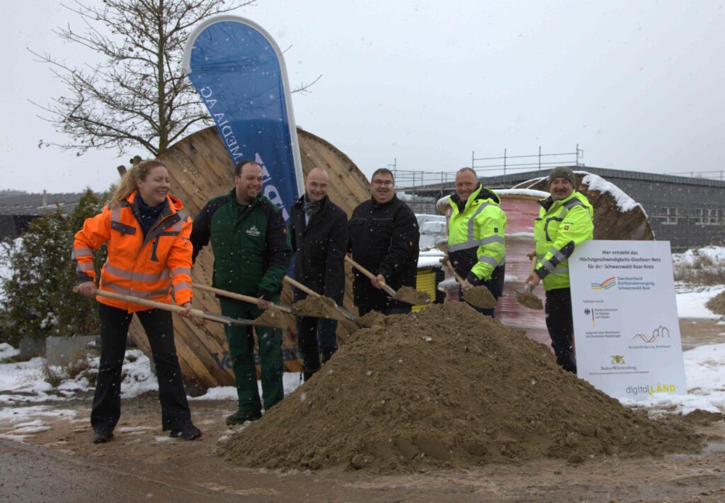 Die ersten Bauarbeiten laufen bereits, jetzt wird es Zeit für den offiziellen Spatenstich. Bürgermeister Martin Ragg kann Ortsbaumeister Hartmut Stern, Vertreter der Baufirma KTS und des Planungsbüros MRK sowie den Technischen Projektleiter des Zweckverbands Breitbandversorgung Schwarzwald-Baar, Heiko Zorn, begrüßen.